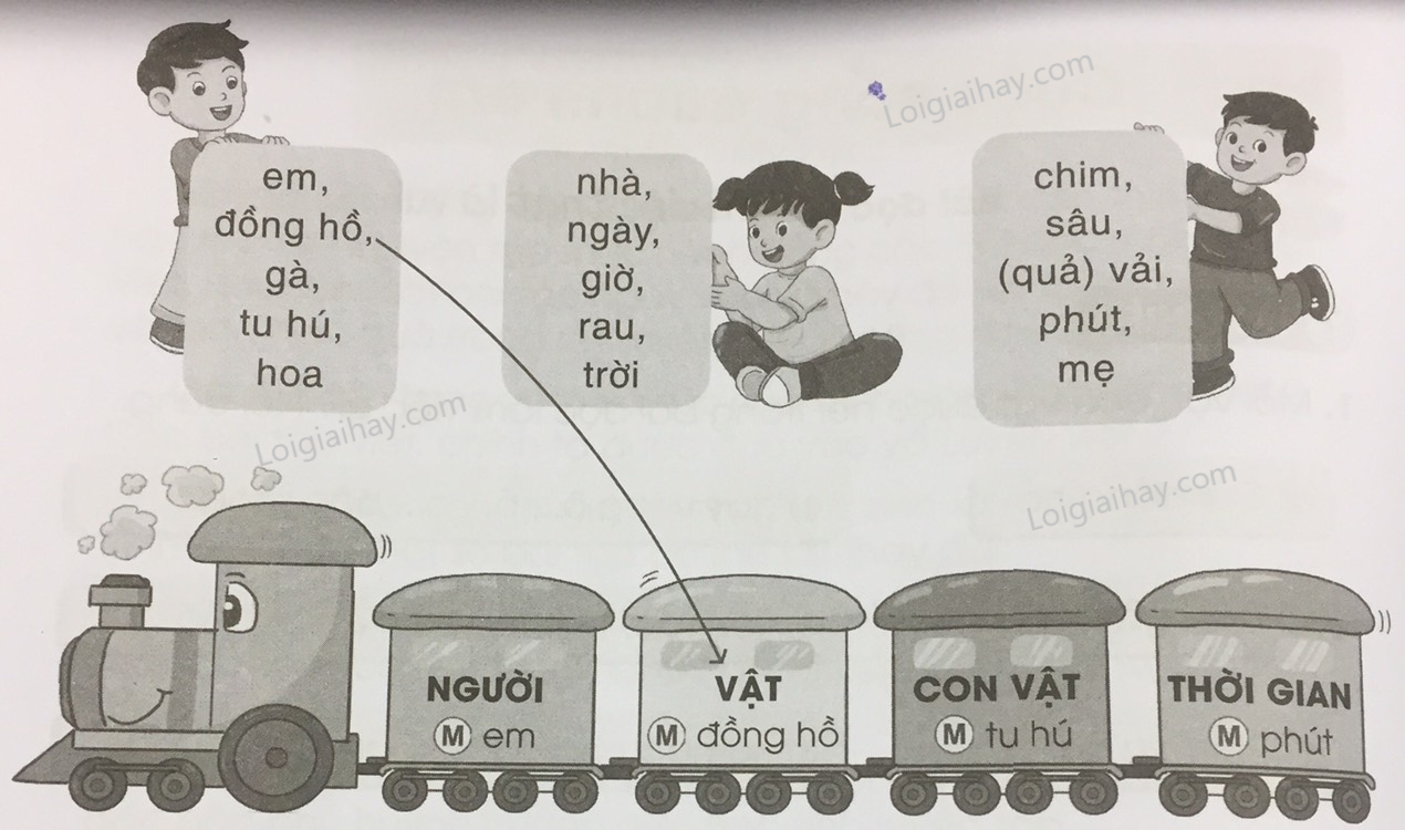 Mỗi vật, con vật được nói trong bài đọc làm việc gì? Bé bận rộng như thế nào? Gạch dưới từ ngữ cho em biết điều đó. Vì sao bé bận rộn mà lúc nào cũng vui? Tưởng tượng mỗi từ ngữ dưới đây là một hành khách. Hãy xếp mỗi hành khách vào toa tàu hợp lý. Viết thêm các từ ngữ ngoài bài đọc chỉ người, vật, con vật, thời gian