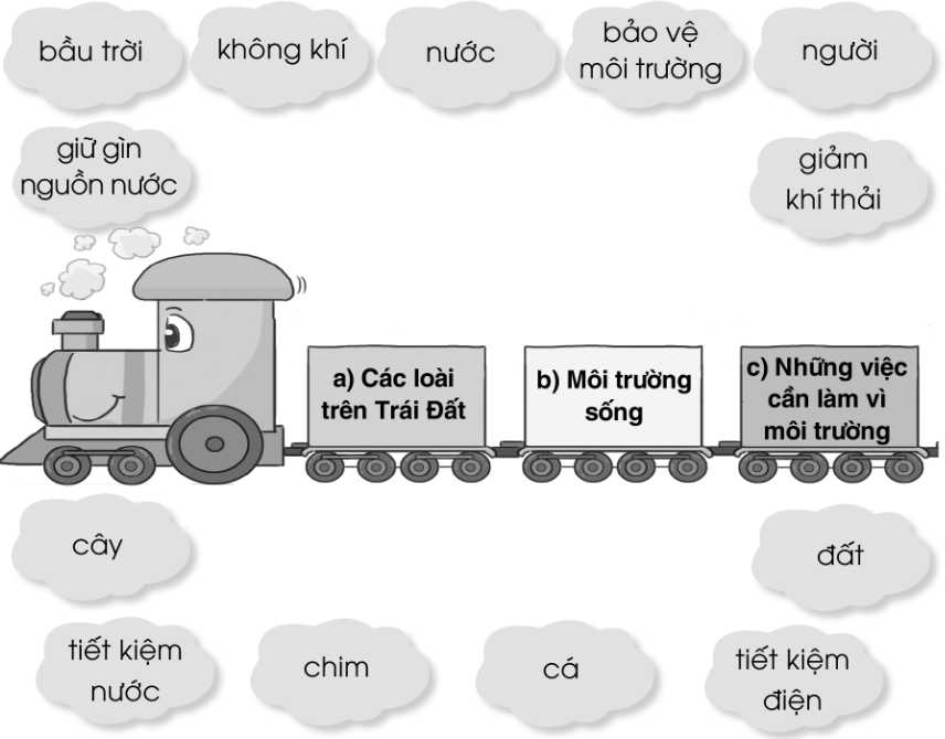 c) Những việc cần làm vì môi trường: bảo vệ môi trường, giữ gìn nguồn nước, giảm khí thải, tiết kiệm nước, tiết kiệm điện.
