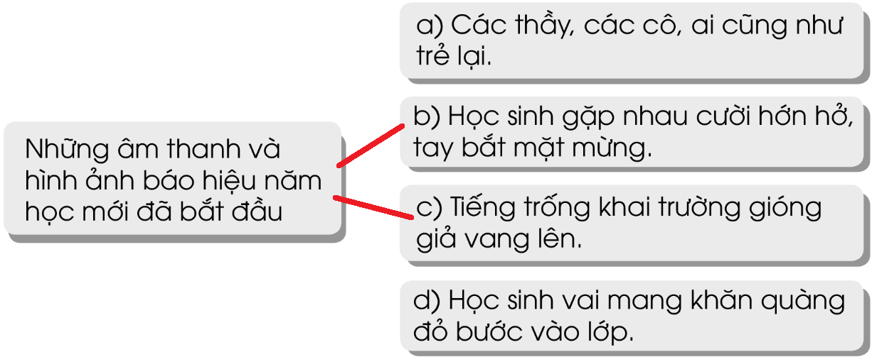 Những âm thành và hình ảnh nào báo hiệu năm học mới đã bắt đầu? Nối đúng: