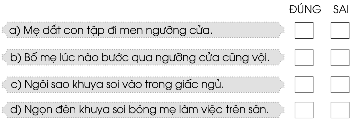 Khổ thơ 1 gợi lại kỉ niệm gì về ngưỡng cửa. Những hình ảnh nào trong bài thơ nói lên nỗi vất vả của bố mẹ? Hình ảnh nào trong bài thơ thể hiện niềm vui bạn bè gắn với ngưỡng cửa? Khoanh tròn chữ cái trước ý đúng. Em hiểu “con đường xa tắp” ở khổ thơ 3 là gì. Tìm từ ngữ có nghĩa giống các từ ngữ dưới đây: soi, xa tắp, thời tấm bé. Đặt câu với một từ ngữ vừa tìm được.
