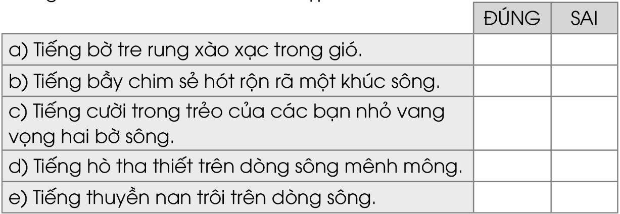 Những âm thanh nào đem lại không khí vui tươi, ấm áp cho dòng sông? Đánh dấu √ vào ô thích hợp: