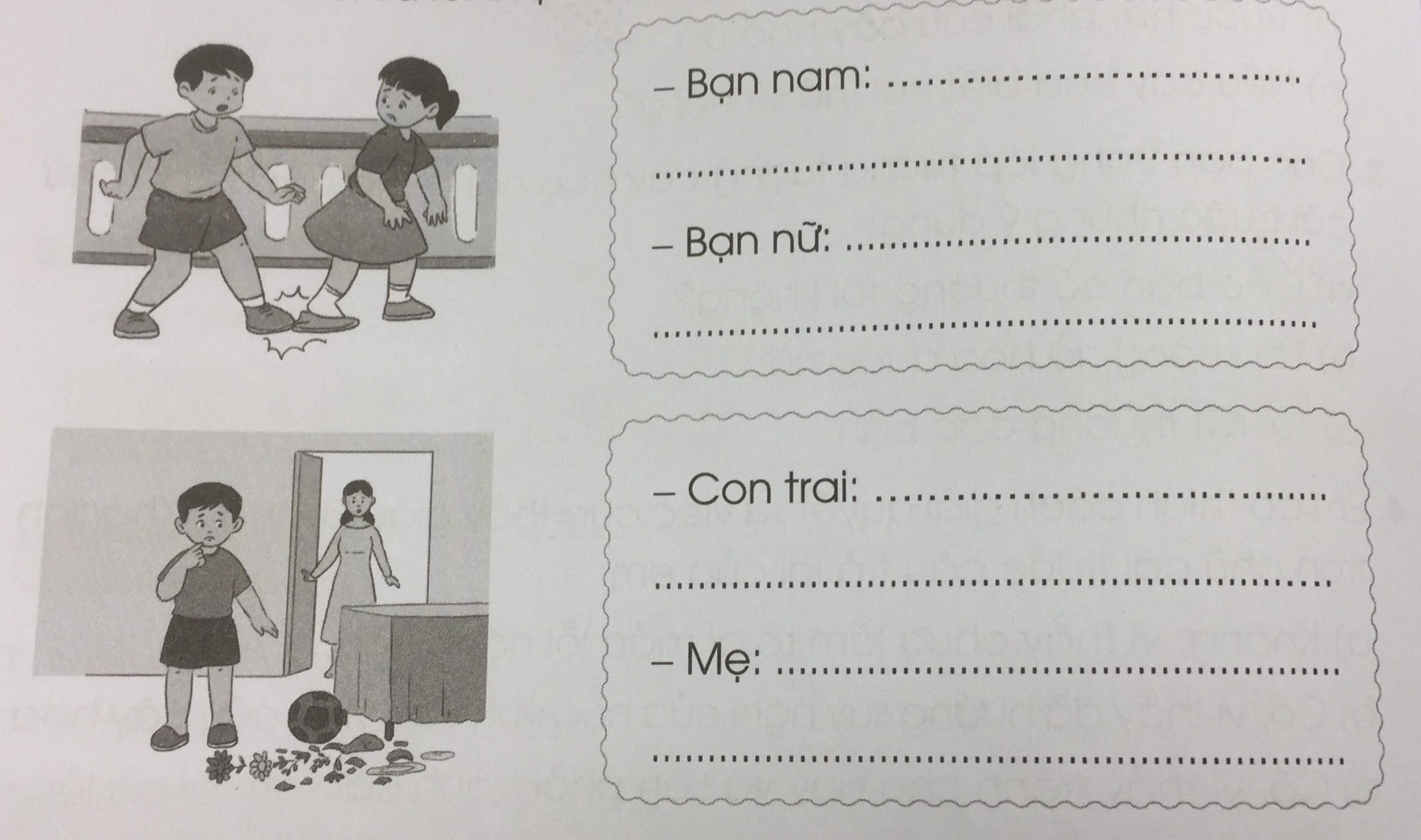 - Tranh 2: Mẹ trông thấy con trai đá bóng làm vỡ lọ hoa.