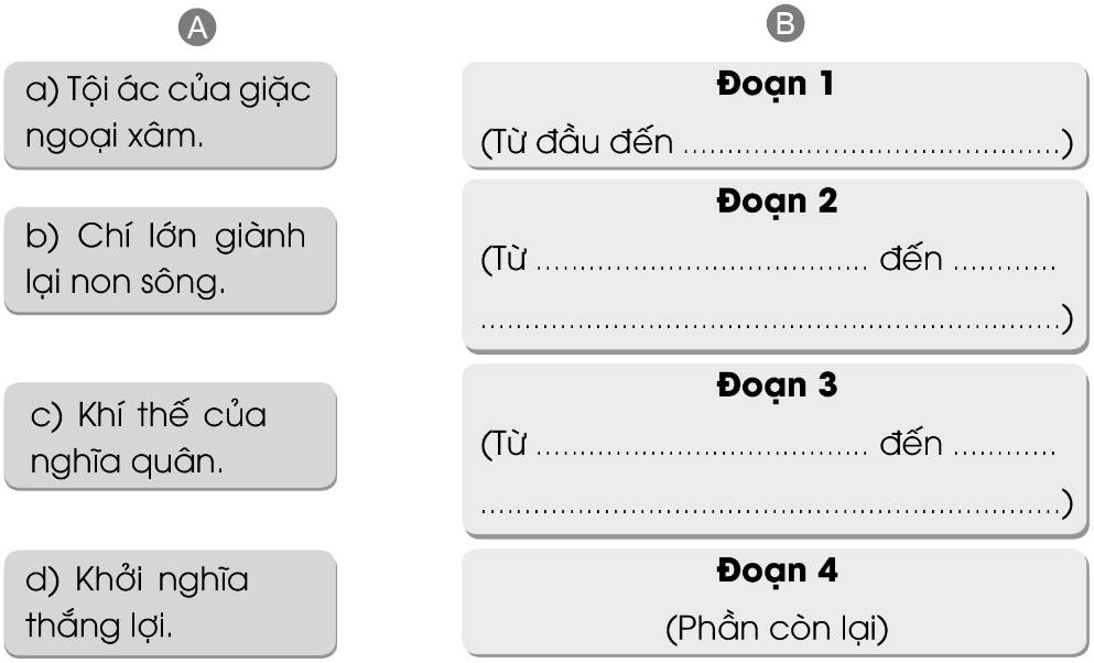 Viết từ ngữ vào chỗ trống để xác định các đoạn văn rồi nối mỗi ý ở bên A với đoạn văn phù hợp ở bên B. Gạch dưới những từ ngữ nói về tội ác của giặc ngoại xâm. Tìm những từ ngữ thể hiện tài năng, chí lớn và khí phách hiên ngang của Hai Bà Trưng. Nối đúng. Viết lại các tên người, tên địa lí trong bài.