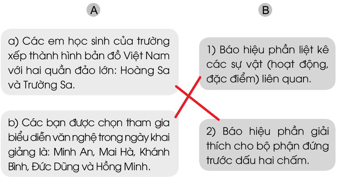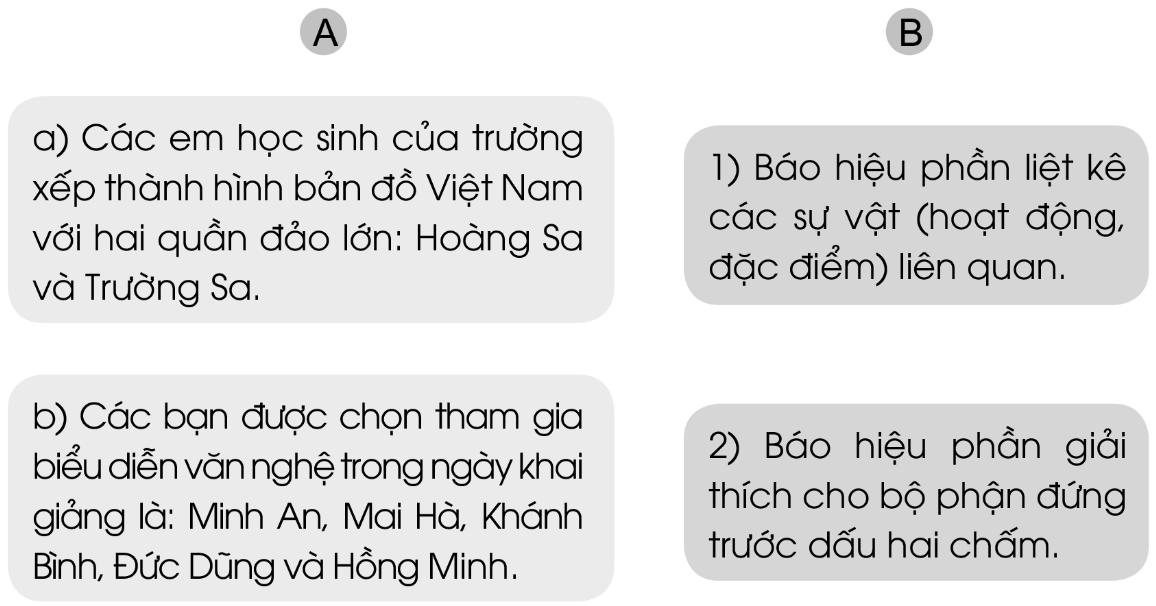 Thêm dấu hai chấm vào vị trí thích hợp trong mỗi câu sau:
