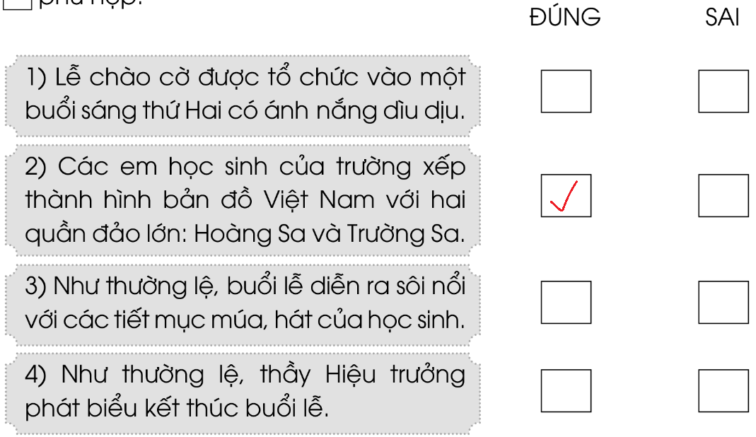 Chi tiết nào cho thấy lễ chào cờ đó rất đặc biệt? Đánh dấu tích vào ô phù hợp.