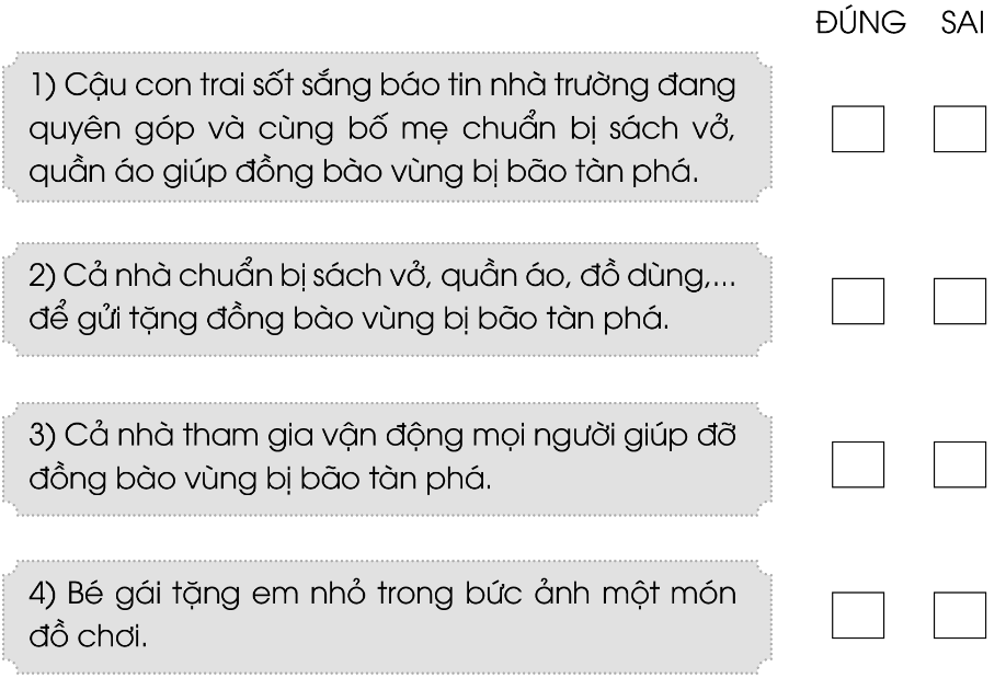 Gia đình hai bạn nhỏ làm gì để giúp đỡ đồng bào vùng bị bão tàn phá? Đánh dấu tích vào ô phù hợp: