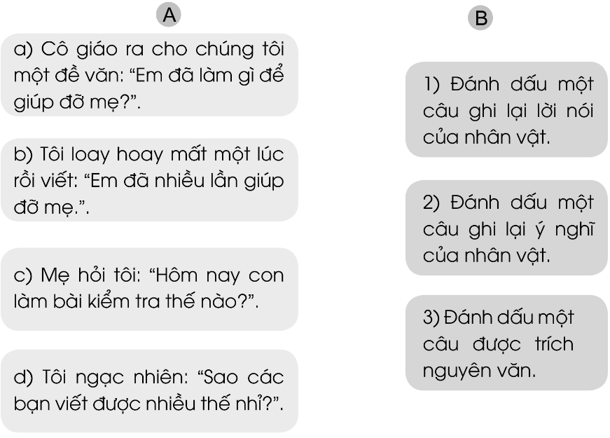 Nối đúng. Tìm những chi tiết cho thấy Cô-li-a lúng túng khi làm bài. Việc nào Cô-li-a kể trong bài tập làm văn là việc bạn ấy chưa làm được. Vì sao khi mẹ bảo Cô-li-a đi giặt quần áo. Em hãy đặt tên khác cho câu chuyện. Dấu ngoặc kép trong mỗi câu dưới đây được dùng làm gì. Viết lại một câu em đã nói với bạn. Sử dụng dấu ngoặc kép để đánh dấu câu đó.