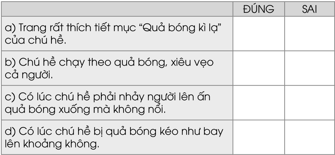 Chú hề biểu diễn với “quả bóng kì lạ” như thế nào? Đánh dấu tích vào ô phù hợp. Vì sao Trang cảm thấy thương chú hề. Theo em, cô gái được chú hề tặng quả bóng là ai. Trang đã làm gì để an ủi chú hề. Đặt câu hỏi cho các bộ phận câu in đậm.