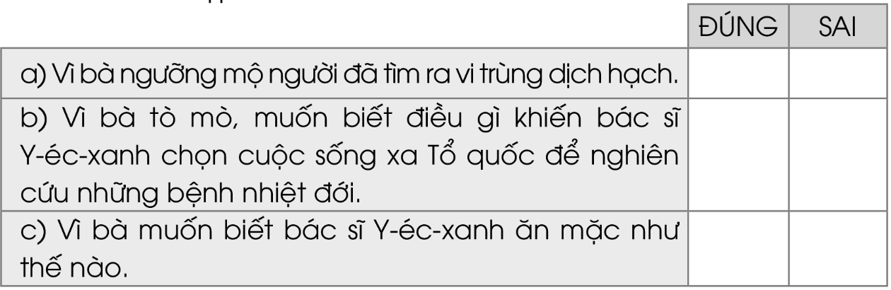 b) Vì bà tò mò, muốn biết điều gì khiến bác sĩ Y-éc-xanh chọn cuộc sống xa Tổ quốc để nghiên cứu những bệnh nhiệt đới. |