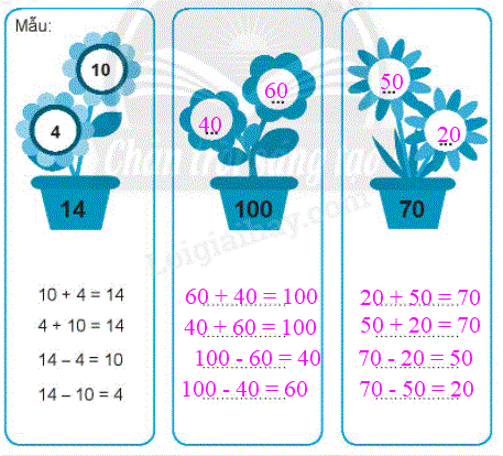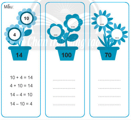 Chọn hai số thích hợp viết vào nhị hoa rồi viết 4 phép tính theo mẫu.