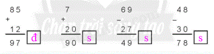 - Thực hiện tính theo cột dọc từ phải sang trái rồi điền đ, s thíc hợp vào ô trống.