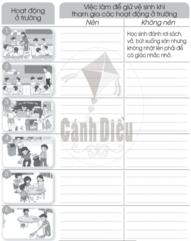Viết ít nhất 3 việc em đã làm để giữ vệ sinh khi tham gia các hoạt động ở trường.