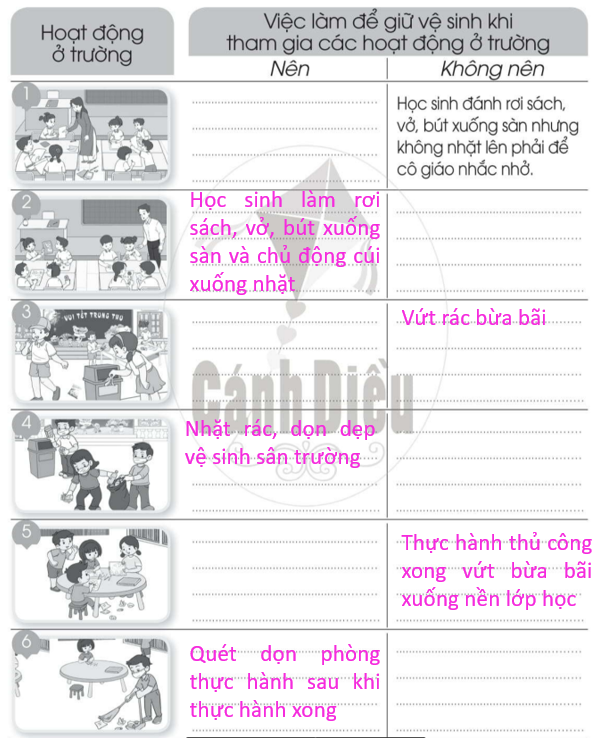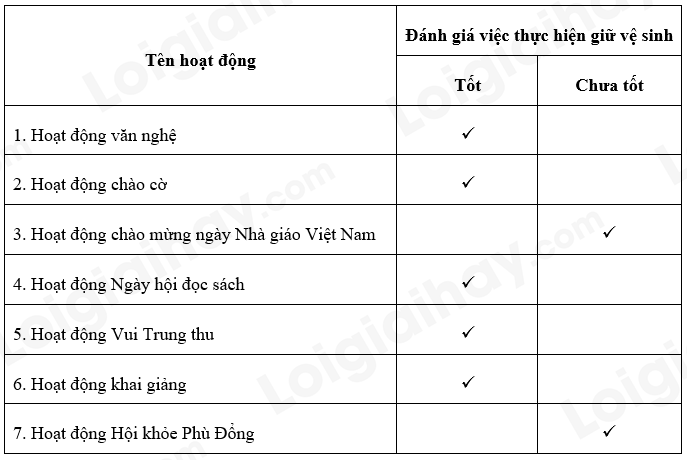 Hoàn thành bảng dưới đây. Viết ít nhất 3 việc em đã làm để giữ vệ sinh khi tham gia các hoạt động ở trường. Tự đánh giá việc giữ vệ sinh của em khi tham gia các hoạt động ở trường vào phiếu dưới đây.