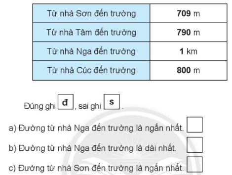 So sánh quãng đường từ nhà mỗi bạn đến trường (cùng đơn vị đo) rồi điền đ, s thích hợp vào chỗ trống.