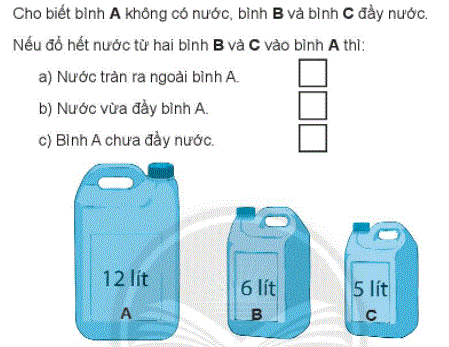 Quan sát hình vẽ rồi tính tổng số lít nước ở bình B và bình C rồi so sánh với bình A.