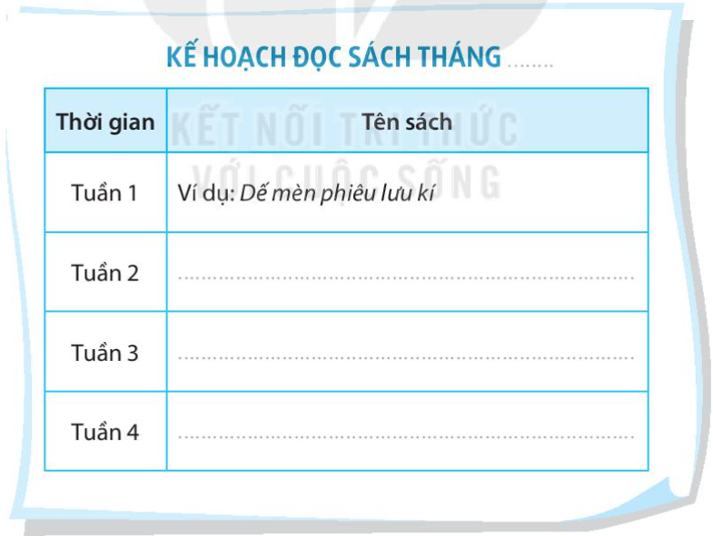 Đánh dấu x vào ô trống trước ý thể hiện hoạt động diễn ra trong Ngày hội đọc sách ở trường em. Ngày nào hằng năm được chọn là Ngày Sách Việt Nam. Lựa chọn từ/cụm từ trong khung điền vào chỗ (…) để hoàn thành các đoạn văn sau về ý nghĩa của Ngày hội đọc sách. Viết khoảng 3 câu vào chỗ (…) dưới đây chia sẻ cảm nhận của em khi tham gia Ngày hội đọc sách ở trường. Em thích cuốn sách nào nhất? Hãy viết 3 đến 5 câu vào chỗ (…) dưới đây giới thiệu về cuốn sách đó. Lập kế hoạch đọc sách trong một tháng