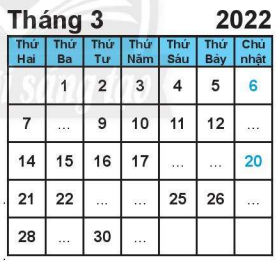 Quan sát tờ lịch tháng 3 rồi điền các số hoặc chữ thích hợp vào chỗ chấm.