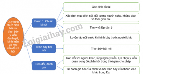 Vẽ sơ đồ tóm tắt quy trình thực hiện bài nói trình bày ý kiến đánh giá, bình luận về một vấn đề xã hội
