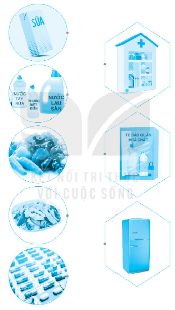 Nối hình đồ dùng, thức ăn, đồ uống với nơi cất giữ, bảo quản phù hợp để đảm bảo an toàn.