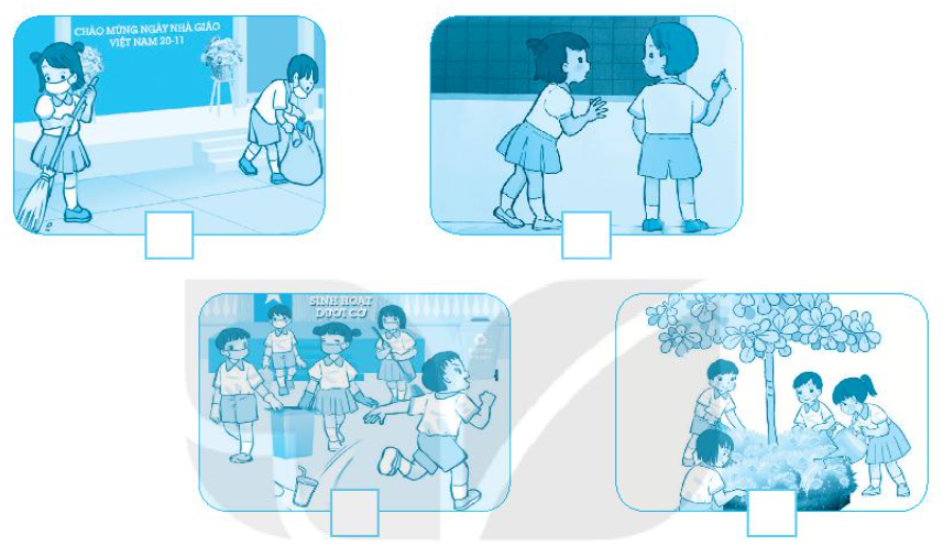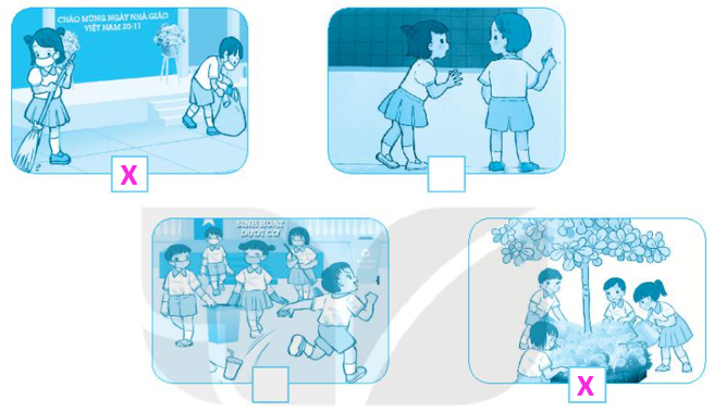 Đánh dấu x vào □ dưới hình thể hiện việc em nên làm để giữ vệ sinh trường học. Giải thích tại sao em làm những việc đó.