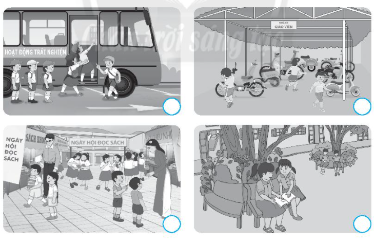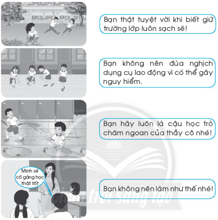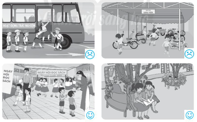 Vẽ mặt cười vào hình tròn ở hình chỉ việc làm em đồng tình, vẽ mặt mếu vào hình tròn ở hình chỉ việc làm em không đồng tình.