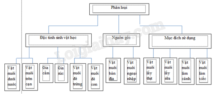 Hãy thể hiện việc phân loại vật nuôi (theo nguồn gốc, đặc tính sinh vật học và mục đích sử dụng) dưới dạng một sơ đồ tư duy.