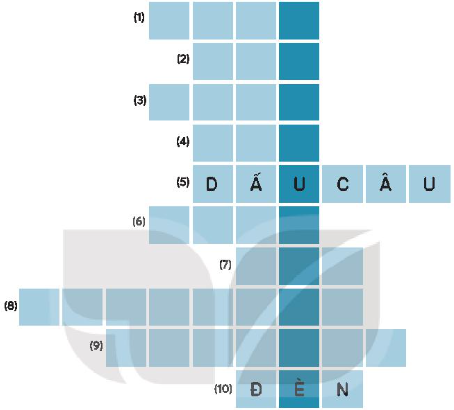 Em trả lời các câu hỏi để tìm các ô chữ hàng ngang, sau đó tìm ra câu xuất hiện ở ô chữ hàng dọc.