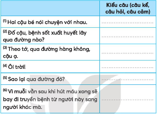 Em đọc các câu và dựa vào dấu hiệu nhận biết các kiểu câu để phân loại.