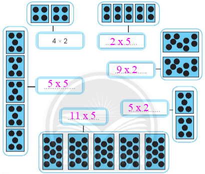Đếm số chấm tròn trên mỗi tấm thẻ và số tấm thẻ rồi viết phép nhân tương ứng.