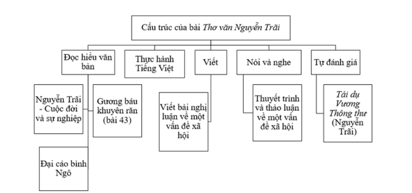Trình bày cấu trúc của bài Thơ văn Nguyễn Trãi gồm bằng một sơ đồ. Nêu các nội dung chính của văn bản Nguyễn trãi – Cuộc đời và sự nghiệp? Nhận xét về các tác phẩm của Nguyễn Trãi (nội dung và hình thức thể loại) được học trong bài này.