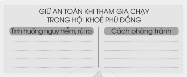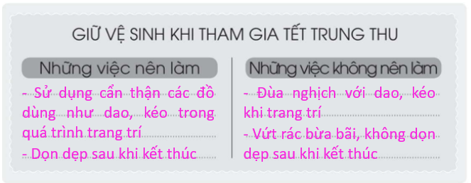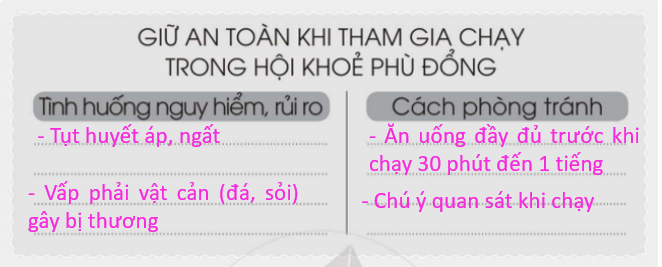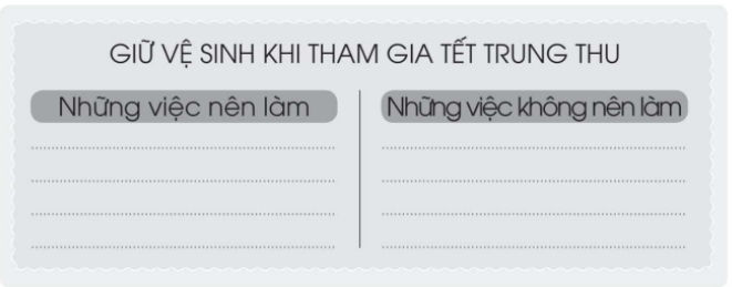 Chọn một trong các sự kiện được tổ chức ở trường và trình bày theo gợi ý dưới đây. Hoàn thành các bảng sau đây. Hãy cùng các bạn nói về lợi ích của việc giữ vệ sinh trường học theo gợi ý dưới đây. Khi đi tham quan, một bạn tách ra khỏi nhóm để chạy đuổi bắt bướm. Trong tình huống này, em sẽ làm gì.