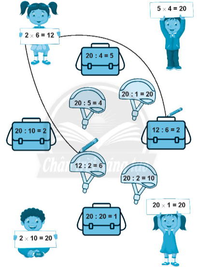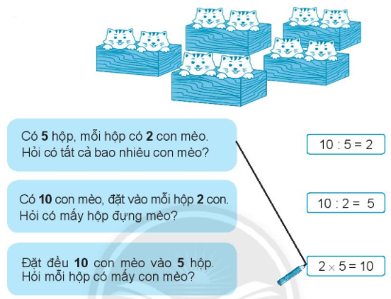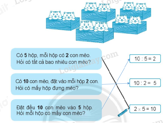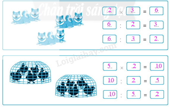 Quan sát tranh, viết phép tính nhân và phép tính chia.