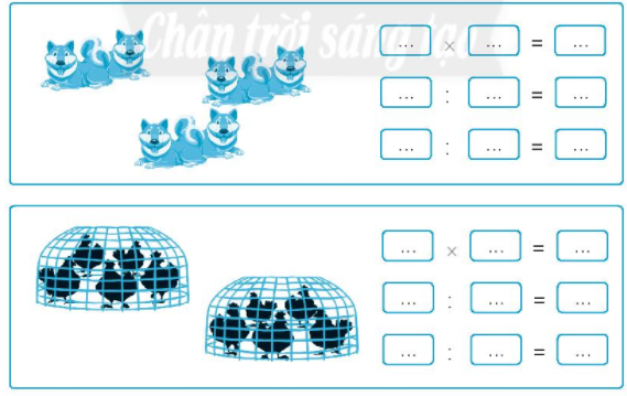 Quan sát tranh, em đếm số con vật trong mỗi nhóm và số nhóm con vật, từ đó viết các phép nhân và chia tương ứng.