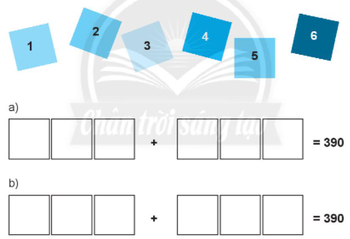 Em thực hiện tính nhẩm rồi đặt các tấm bìa ghi chữ số vào các ô vuông để có hai phép tính cộng khác nhau có tổng là 390. (mỗi tấm bìa chỉ đặt 1 lần)