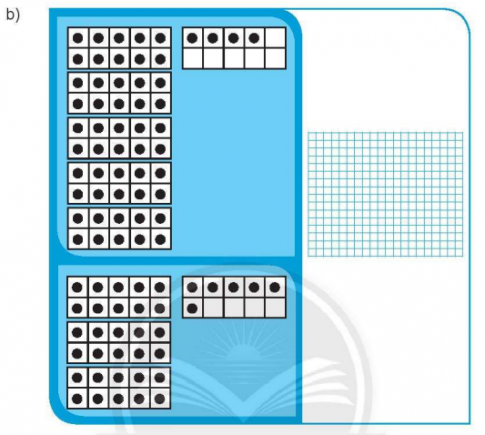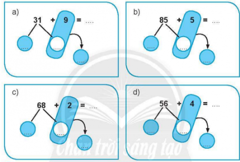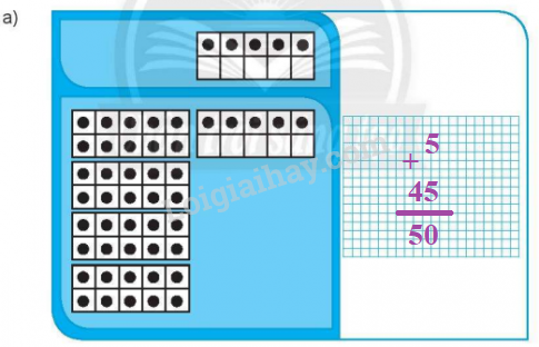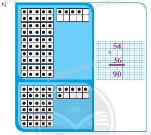 Quan sát ví dụ mẫu, ta đếm số chấm tròn ở ô trên và ô dưới để xác định các số hạng, sau đó đặt tính rồi tính.