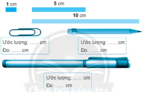 Dựa vào độ dài ba băng giấy dưới đây, em ước lượng rồi đo độ dài một số vật theo đơn vị xăng- ti-mét. (Thực hành với các hình ảnh trong sách và với các vật quanh em.)
