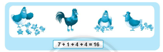 Tính xem có tất cả bao nhiêu con gà. Tính tổng các số hạng bằng nhau rồi viết theo mẫu.