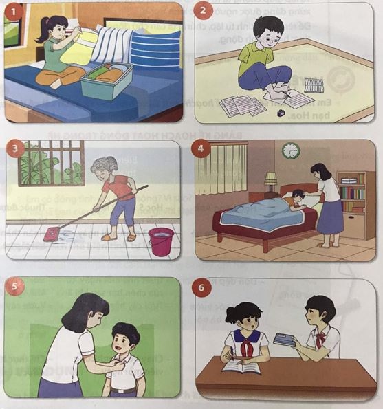 1. Theo em, biểu hiện của tự lập là: hình ảnh 1, 2, 3; biểu hiện chưa tự lập: 4, 5, 6.