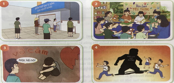 - Hình ảnh 1 là hình ảnh thể hiện sự yêu thương con người, giúp đỡ những người nghèo khổ, phát gạo miễn phí cho người nghèo; Hình ảnh 2 thể hiện sự yêu thương, giúp đỡ bạn bè, đoàn kết trong lớp, trong trường học, tiệm sách yêu thương giúp các bạn có thể gắn kết và xích lại gần nhau hơn.