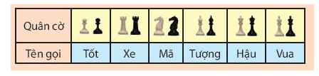 Cho biết tên gọi của các quân cờ trên bàn cờ vua như sau: