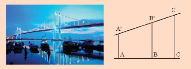 Những sợi cáp treo của cầu Thuận Phước (thuộc thành phố Đà Nẵng) cho ta hình ảnh những đoạn thẳng song song. Các đoạn thẳng song song \(AA',BB',CC'\) thể hiện ba sợi cáp của cầu. Nếu biết độ dài các đoạn \(AB,BC,A'B'\), có thể tính độ dài \(B'C'\) không?
