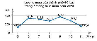 Số liệu về lượng mưa M (mm) trong 7 tháng mùa mưa của thành phố Đà Lạt năm 2020 được biểu diễn theo số n chỉ số trong tháng có biểu đồ dưới đây.