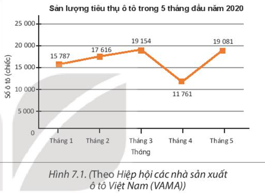 Hình 7.1 là biểu đồ đoạn thẳng mô tả sản phẩm tiêu thụ ô tô của thị trường Việt Nam trong 5 tháng đầu năm 2020. Em hãy cho biết trong tháng nào thì số lượng ô tô tiêu thụ là ít nhất