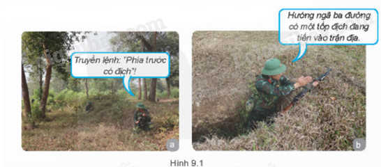 Hình 9.1 là hình ảnh chiến sĩ trinh sát đang thông báo, truyền lệnh, thông tin cho đồng đội ở tuyến sau trong quá trình chiến đấu