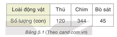 Dữ liệu trong Bảng 5.1 biểu diễn số lượng của các loài động vật.