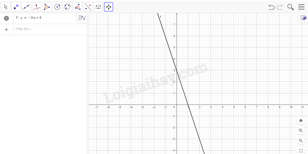 a) Nhập hàm số \(y = - 3{\rm{x}} + 3\) trên ô lệnh, màn hình sẽ hiện thị đồ thị của hàm số