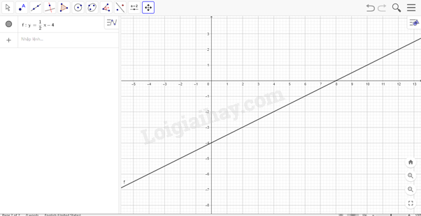 b) Nhập hàm số \(y = \frac{1}{2}x - 4\) trên ô lệnh, màn hình sẽ hiện thị đồ thị của hàm số