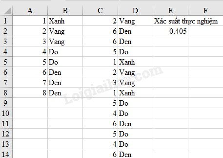 Trong ô E1 ghi “xác suất thực nghiệm”