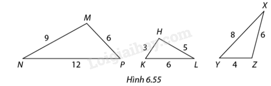 Chỉ ra các cặp tam giác đồng dạng trong Hình 6.55. Viết kí hiệu về sự đồng dạng của chúng và xác định tỉ số đồng dạng.
