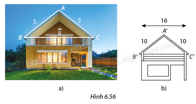 Trên bản vẽ thiết kế mặt tiền ngôi nhà ở Hình 5.65b, khoảng cách thực tế giữa các đỉnh \(A',B',C'\) của mái nhà là \(A'B' = A'C' = 10\,cm,B'C' = 16\,cm.\) Trên thực tế, mái nhà được xây dựng có kích thước \(AB = AC = 5\,m\) và \(BC = 8\,m\) (Hình 5.56a). Hỏi mặt tiền của mái nhà có được xây dựng đúng với hình dạng như được thiết kế không?
